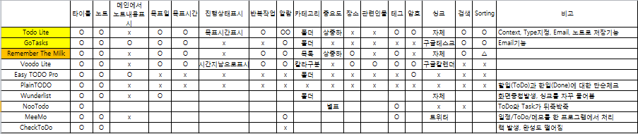 아래 있는 NooTodo, MeeMo, CheckToDo는 테스트 하다가 더이상 테스트 할 가치가 없어서 진행을 안한 까닭에 O/X표시가 없습니다.