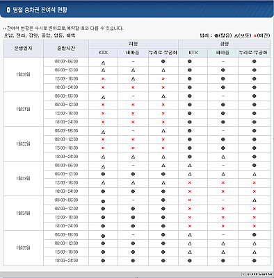 내년 설 승차권 예약완료 Posted on 2011년 12월 21일 by selfhood 감사하게도 올해에도 내년 설 승차권을 예약완료했다. 올해는 6시가 아닌 7시부터 예약을 받기 시작해서 한시간 정도 일찍 일어나서 회사에 와서 예매를 해야 했다. 연휴가 시작되는 저녁시간대와 연휴가 끝나는 오후시간대의 표부터 점점 사라지기 시작하는 것을 볼 수 있다. 7시 7분 예약상황 7시 12분 예약상황