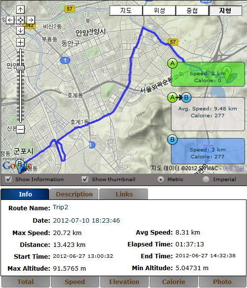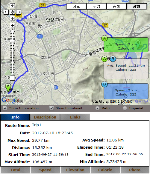 아이폰 BikeMateLite로 기록된 내용인데, GPX데이터 내보내기가 안되는 탓에 구글 맵 등에서 볼 수는 없다.