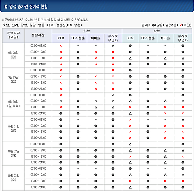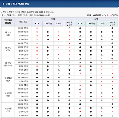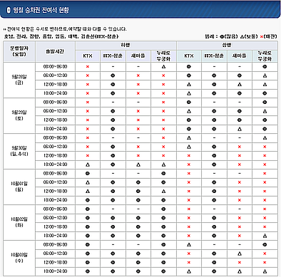 추석 승차권 예약완료 Posted on 2012년 9월 6일2012년 9월 6일 by selfhood 추석 승차권을 예매했다. 오전 7시부터 예매가 시작되기에?일찌계속 확인버튼을 누르다 빈 화면이 나온 것 중에 하나가 성공. 인터넷의 누구 말대로 열차번호로 했다가 안될 뻔 했다. 시간대로 다시 입력했을 때 성공. 올해도 편히 다녀올 수 있겠다. 7시 10분경 예매상황 7시 12분경 예매상황, 빠르게 표가 사라지고 있다. 7시 28분 예매상황, 하행선과 상행선의 대조되는 모습을 보라.