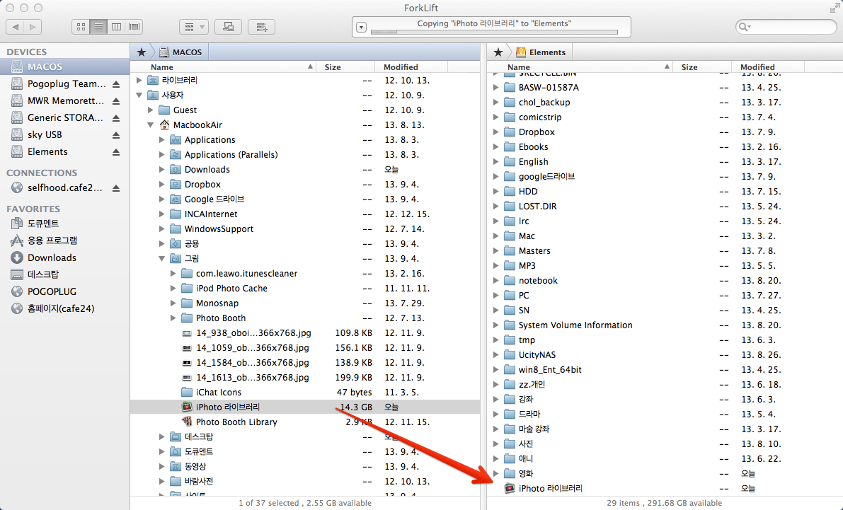 예를 들어 맥북에어의 ‘iphoto 라이브러리’를 외장형 하드에 백업 하기 위해 예전에 복사를 해놓았는데, 다시 여기에 최근 사진을 추가(append)시키기 위해 ‘iphoto 라이브러리’ 폴더를 option키를 누른 상태로 움직였더니 모두 유지할 것인지, 중지할 것인지, 대치할 것인지만 물어올 뿐 병합이라는 메뉴가 안뜨는 것이다.