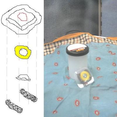 렌즈가 고정되기를 조금 기다린 뒤, 드롭프스에 렌즈크기보다 크고 노랑 플라스틱링의 바깥 둘레보다는 작은 구멍을 뚫은 뒤 역시 본드를 칠하고