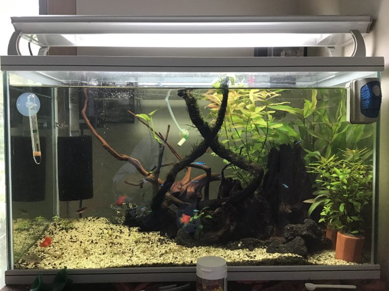전경으로 심었던 피그미 체인의 잎이 다 녹아버려서 죽은줄 알았는데, 새로운 잎이 나고 있다. 이끼들도 조금씩 활착을 시작했다. 유목들은 이제 물을 빨아들여서인지 떠오르지 않는다. 얼마 전 플래티가 출산을 해서 탈각알테미아와 핀셋, 가위, 자석 유리닦이를 사왔다.