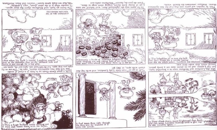 Gustave Verbeek was born in Nagasaki, Japan, in 1867. He was the son of a Belgian missionary, head of the Tokyo School, which would become the Imperial University. His childhood was spent in Japan, he then studied in Paris, and finally moved to the United States in 1900 to begin a collaboration with a number of important illustrated magazines (Harper’s, Saturday Evening Post). A few years later he entered the New York Herald, where he published three original comic strips: The Upside Downs of Little Lady Lovekins and Old Man Muffaroo (1903-1905 – this could be read rightside-up and upside down, every panel making sequential sense in both directions!), The Terrors of the Tiny Tads (1905-1915), and The Loony Lyrics of Lulu (1910). In the 1920s Verbeek retired from comics and became a painter and sculptor. He died in 1937.